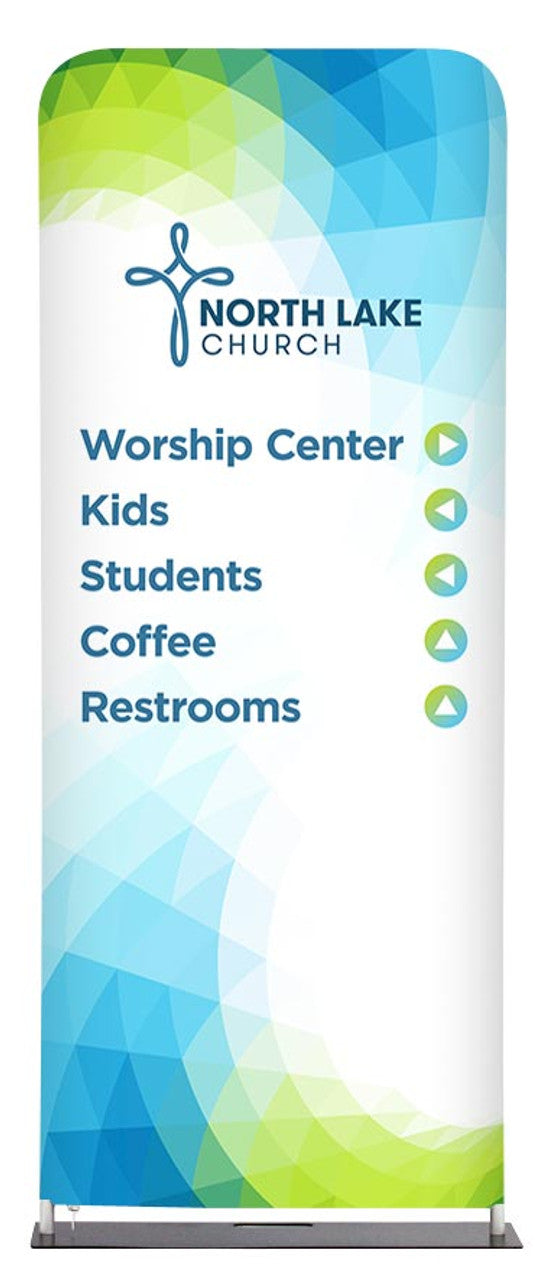 This display can be purchased with hardware + graphic or as a replacement graphic only. Assembly is simple with numbered aluminum tubing and a sturdy steel base. Once assembled, the pillowcase-style graphic slides over the frame and zips shut at the bottom for a clean, professional look.